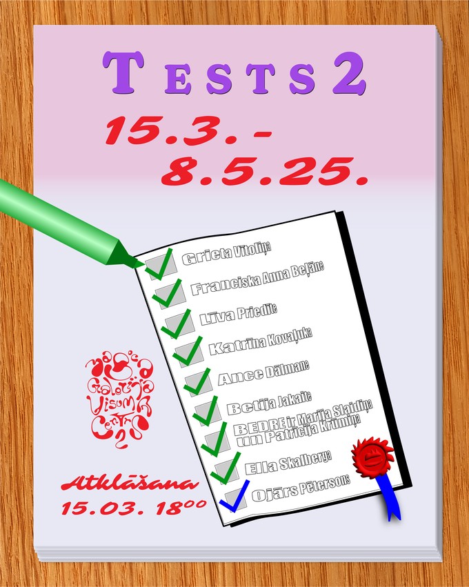 15. martā pulksten 18.00 MABOCA galerijā Visuma Centrs 2 tiks atklāta izstāde "Tests 2". Atklāšanas neformālajā daļā jūs priecēs priekšnesumi no grupas “Caurums”, “Kovaļuka un sīkās” un “cindyshoes x gloriaboots”.