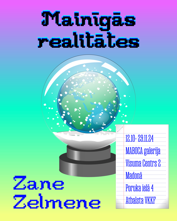 Pievēršoties cilvēka apziņai un tehnoloģijām ir radīta izstāde “Mainīgās realitātes”, kas no 12. oktobra būs skatāma MABOCA galerijā Visuma Centrs 2, Madonā. Video māksliniece Zane Zelmene piedāvā savu jaunāko personālizstādi, pētot saikni starp apziņu, identitāti un mainīgo uztveres dabu. Izstāde aicina skatītājus doties daudzsajūtu ceļojumā, kas pārsniedz tradicionālo telpisko robežu, sniedzot aizraujošu cilvēka pieredzes izpēti caur mākslas, tehnoloģiju un pašrefleksijas krustpunktu.