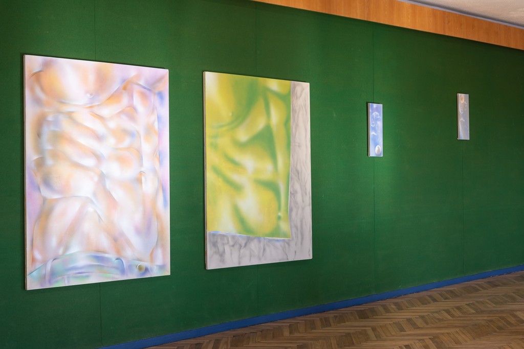 The exhibition title “Sticky Fingers” references the Rolling Stones album cover “Sticky Fingers”, which features a sexualized image of a man in jeans. The author of that image is Andy Warhol. Just as Warhol used screen printing to reproduce and elevate pop culture icons of his time, I too, through the language of painting, have multiplied various motifs to reveal the ideals and symbols of human bodily beauty.”